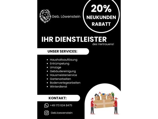 Die Geb. Löwenstein GbR, mit Sitz in Frickenhausen, ist Ihr professioneller und verlässlicher Ansprechpartner für Umzüge, Reinigung, Garten- und Landschaftspflege sowie Entrümpelung. Mit einem breit gefächerten Dienstleistungsangebot stehen wir sowohl Privathaushalten als auch Unternehmen zur Seite. Unsere Expertise und Leidenschaft in jedem unserer Arbeitsbereiche garantieren einen Service, der keine Wünsche offen lässt.