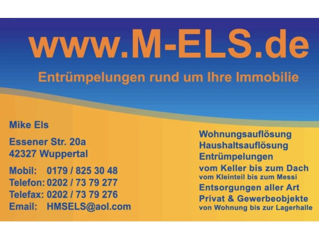 In Fragen von Wohnungsauflösungen, Haushaltsauflösungen und Entrümpelungen bieten wir Ihnen von der Firma Mike Els aus Wuppertal individuelle Lösungen und ein erfahrenes und eingespieltes Team. Auch Messiewohnungen, Dachboden- oder Lagerräumungen stellen für uns kein Problem dar. Wir würden uns freuen, wenn wir Sie bei uns in Wuppertal oder gleich direkt bei Ihnen vor Ort über unser Leistungsspektrum informieren dürfen.